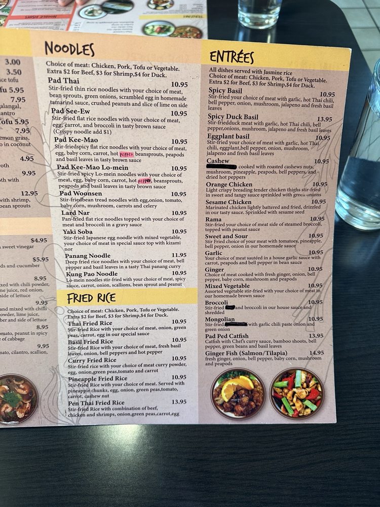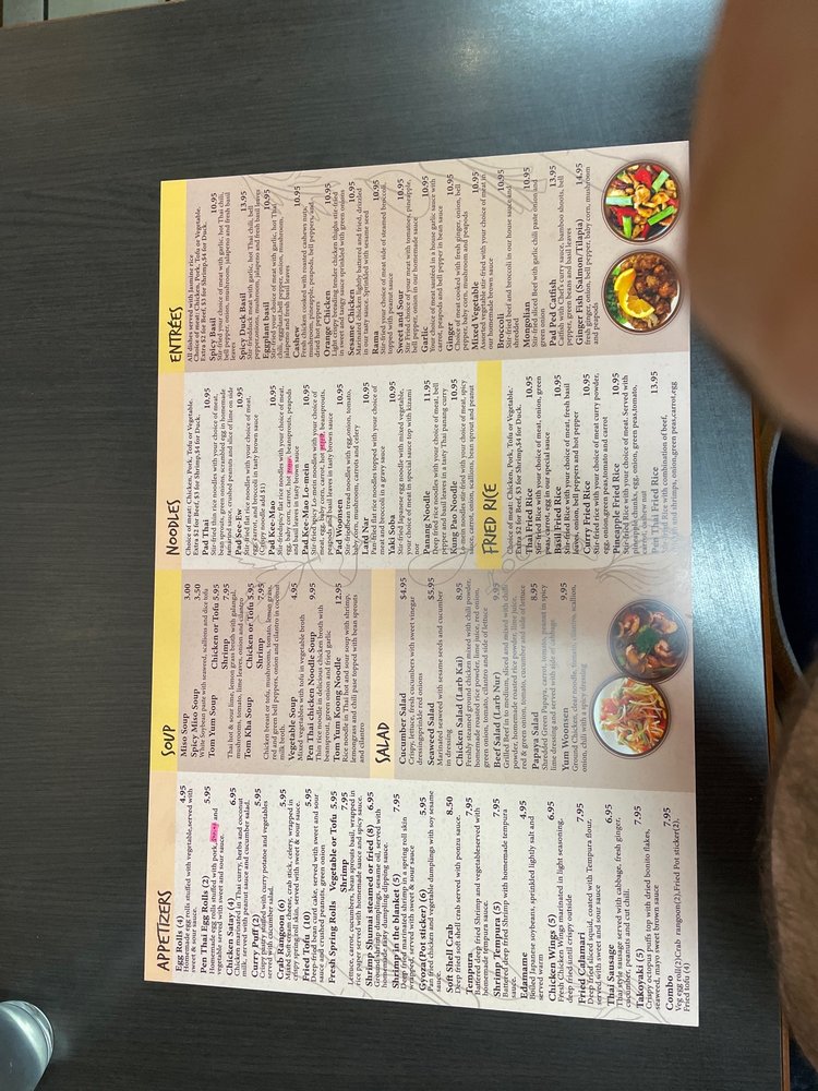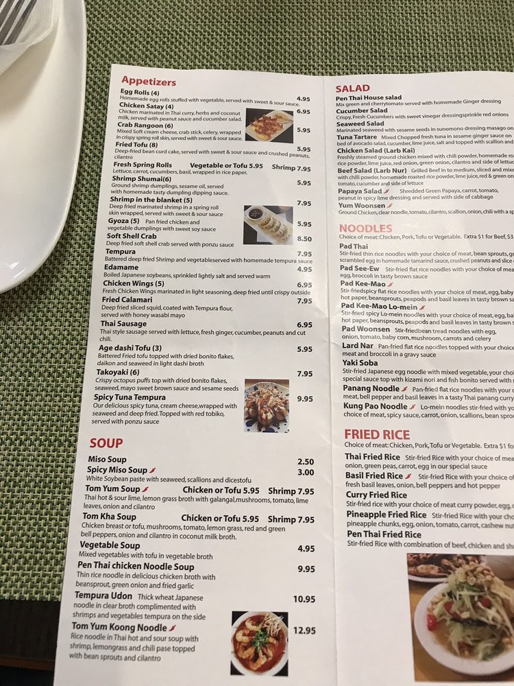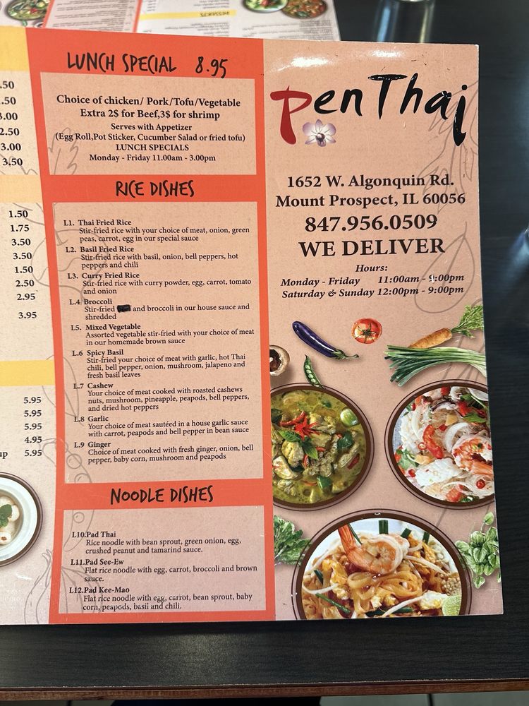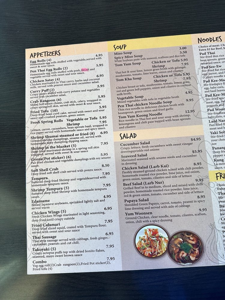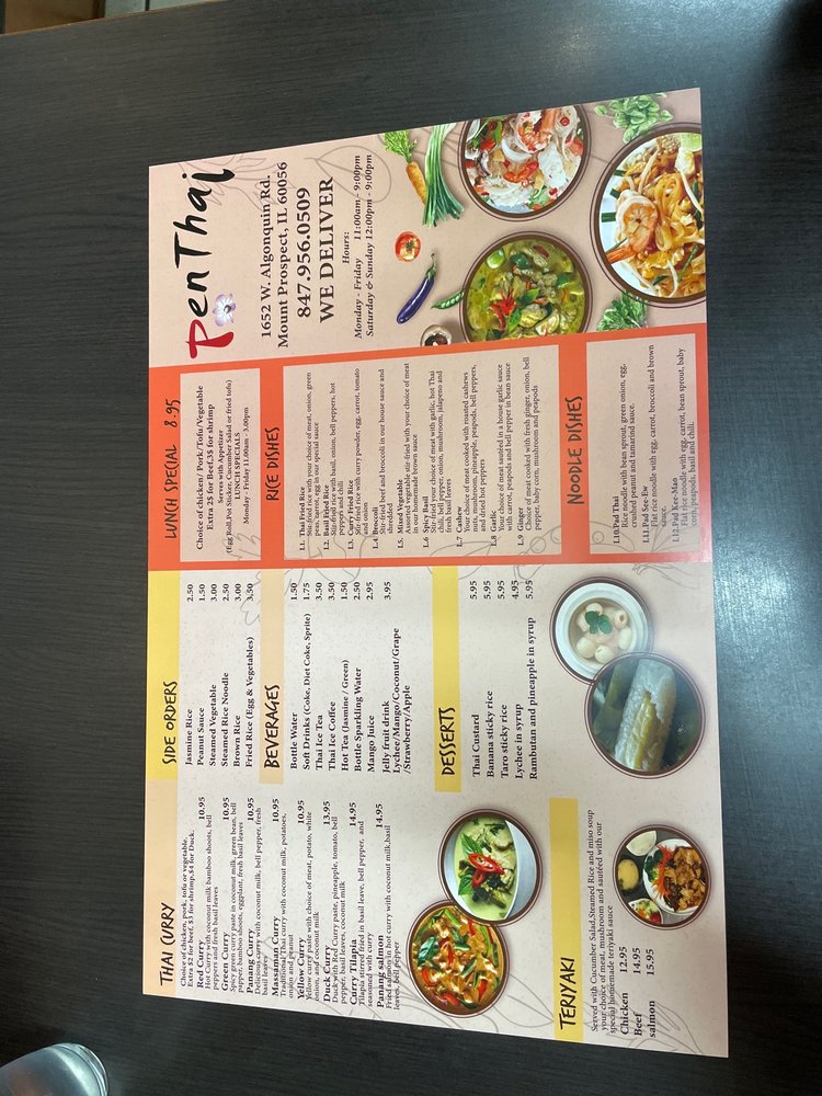 Introducing the menu at Pen Thai, a Thai restaurant offering a range of flavorful dishes and a cozy atmosphere in Mount Prospect, IL. With a focus on fresh ingredients and bold flavors, Pen Thai impresses customers with its diverse menu. From crispy Egg Rolls and Chicken Satay to fragrant Tom Yum Soup and creamy Tom Kha Soup, there is something for every palate. Customer reviews praise the Kung Pao Noodle, Pad Kee Mao, and Pen Thai Egg Rolls for their freshness and flavor, making them must-try items. The restaurant also offers a variety of beverages, including Thai Iced Tea and Hot Coffee. With friendly service and vegetarian options available, Pen Thai is a recommended spot for a delicious Thai dining experience.